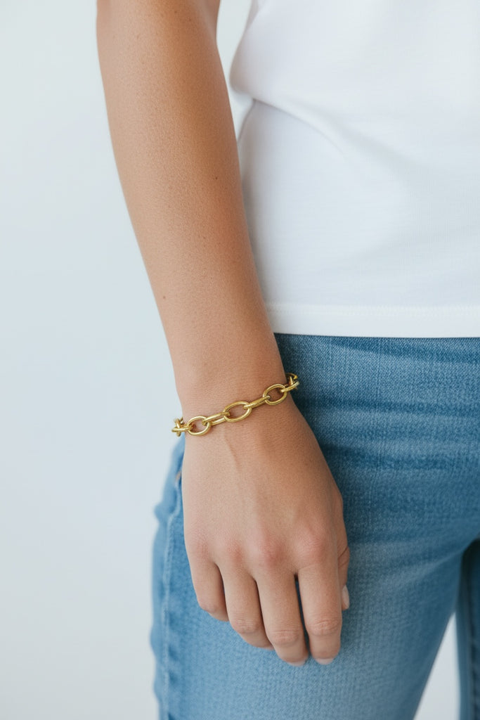 Disfruta usar tu Pulsera Cadena Lulú Acero Baño Oro. Su hermoso diseño de cadena te brinda la versatilidad para usarla en cualquier ocasión. Un accesorio simple pero refinado que añadirá un toque de estilo a tu atuendo.