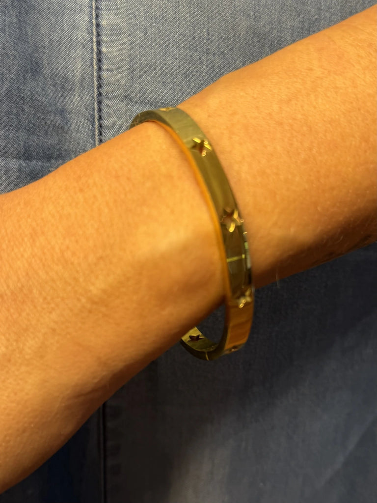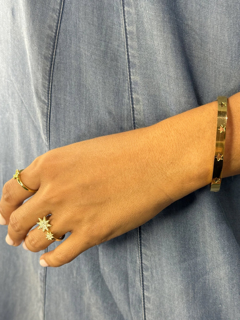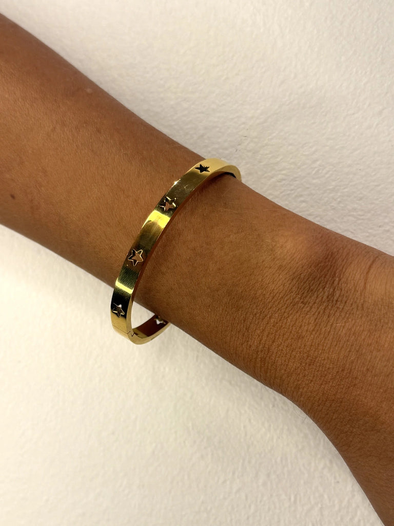 ¡Luce elegante con nuestra esclava bañada en oro con detalles de estrellas! El complemento perfecto para cualquier outfit, su diseño único y detallado te hará destacar en cualquier ocasión. ¡No te pierdas esta joya imprescindible en tu colección!